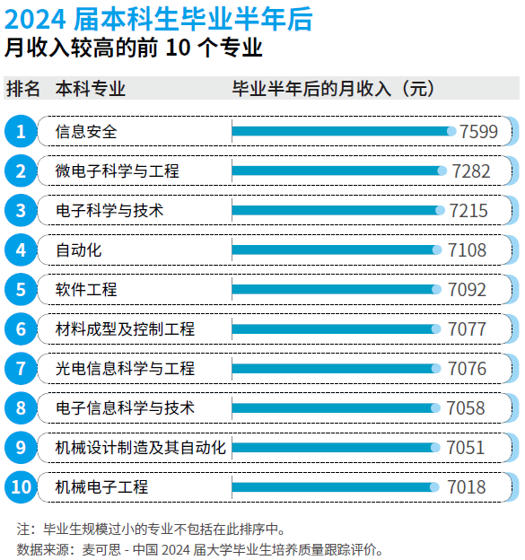 这些"绿牌"专业在就业市场表现抢眼,不仅薪资水平位居前列,更以高专业匹配度和就业满意度著称。数据显示,2024届微电子科学与工程专业毕业生平均月收入达7282元,高居本科专业收入榜第二位;电气工程及其自动化专业的就业相关度和满意度分别达到86%和85%。