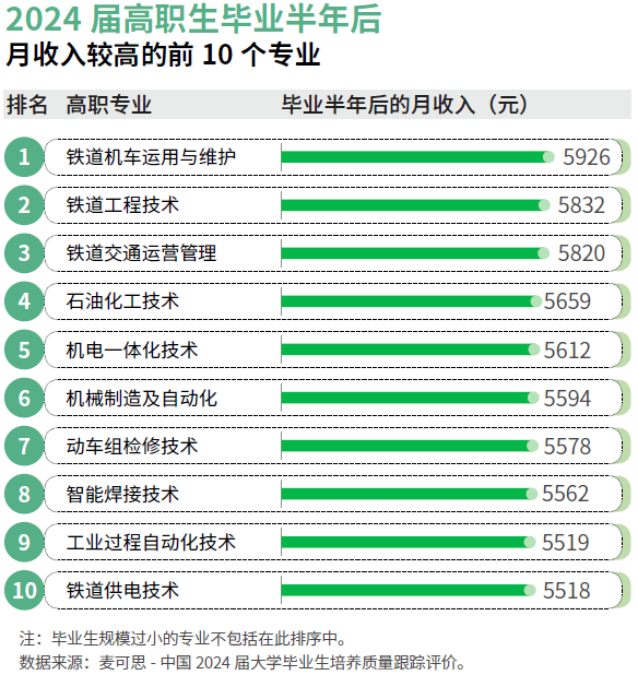 在就业质量方面,这些"绿牌"专业表现亮眼。2024届铁道机车运用与维护专业毕业生平均月收入达5926元,位列高职专业榜首,就业满意度和专业相关度均超过84%;应用化工技术专业毕业生月收入5481元,专业相关度81%,展现出良好的职业发展前景。